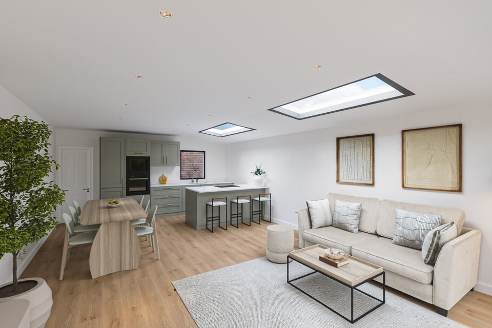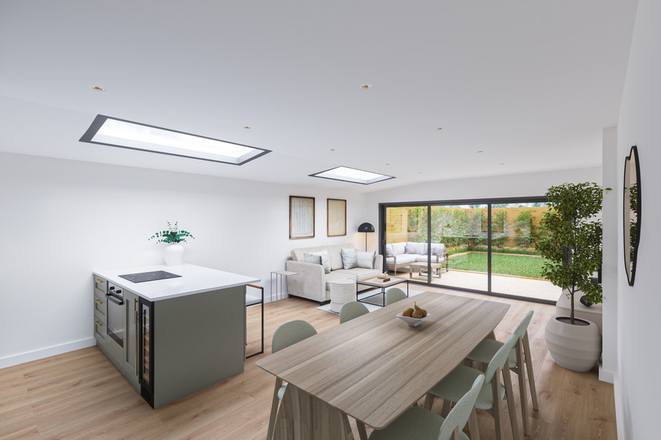 At the end of the hall, open to your large open-plan reception/kitchen/dining room, running over 7 metres. Slide open wall-spanning doors from here to the low-maintenance, newly-fenced garden.