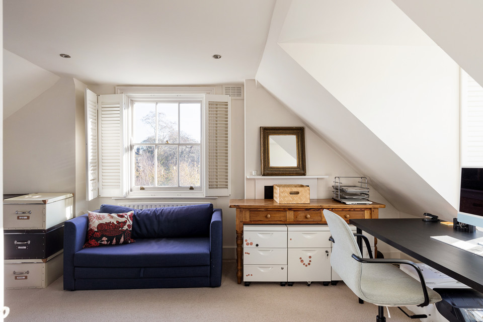 Your top floor hosts the property’s second bathroom (again with an independent shower), and a pretty double-aspect bedroom currently enjoyed as a home office with sofabed. Generous accessible eaves storage is found up here as well. This floor is a natural guest, lodger or au pair suite if you don’t need all the bedrooms yourselves.