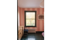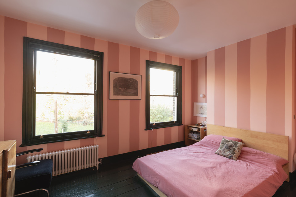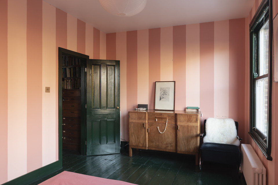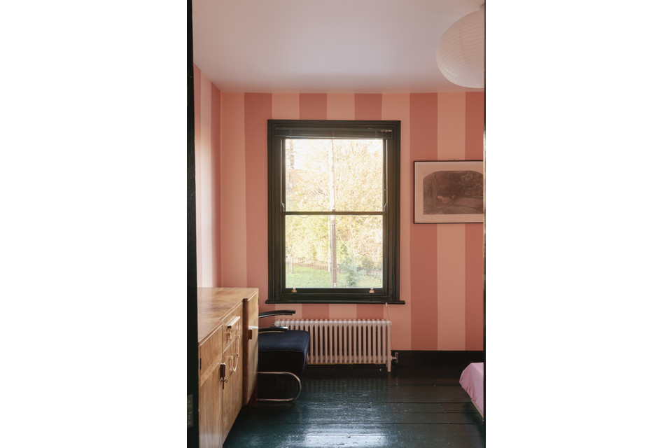 From the main landing you have bedroom two to your right, of over 11 feet by over 9 feet. Then across the front of the terrace is your principal twin-sashed bedroom (views over public greenery here), of 15 feet by nearly 10 feet. Wonderful wide pink stripes to the walls are teamed with deep green walls and all woodwork.