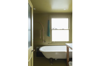 Next door is a generous windowed bathroom, with both free-standing bath and a wet-room style independent shower area. Traditional-style fittings and a marble-topped wash stand further impress.