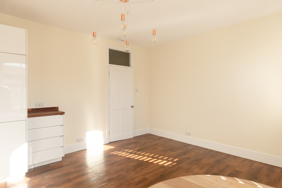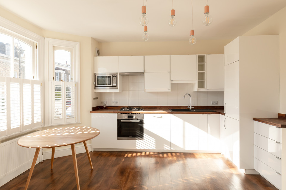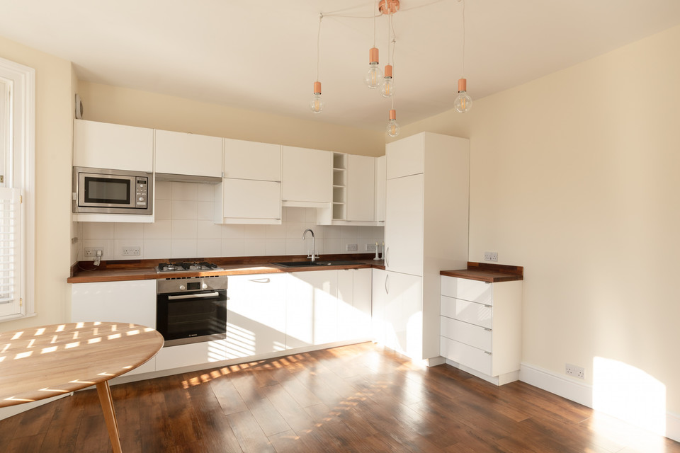 Then across the front of the building is your big, bright, southeasterly-facing open-plan reception/kitchen. Custom-made shutters grace the lower sash panes for privacy and light control. Modern white units are plentiful and are paired with wooden worktops. Integrated appliances are included in the sale.