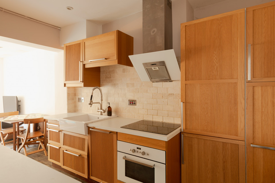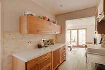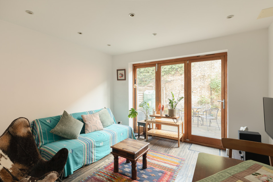 The downstairs w.c. sits next to the stairs. Your independent kitchen is on your right, with oak units, travertine tiling, and a ceramic Butler sink with gadget tap. Your reception room (an addition to the original building) is over 11 feet by over 10 feet, with timber-framed folding doors delivering you to your part-walled garden.