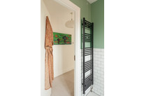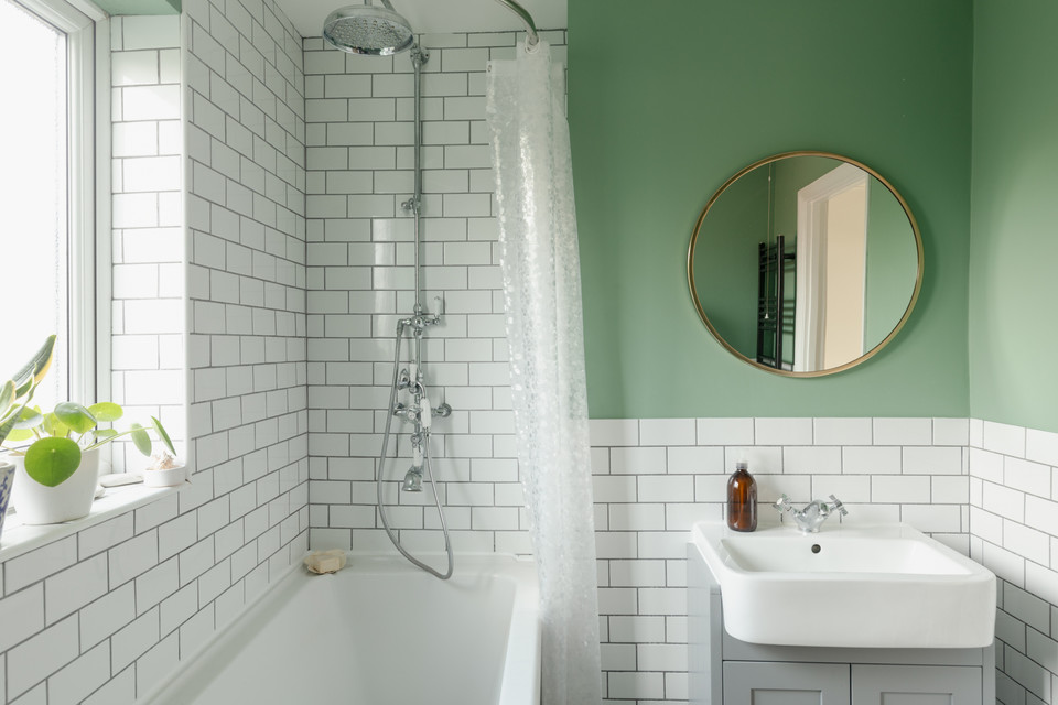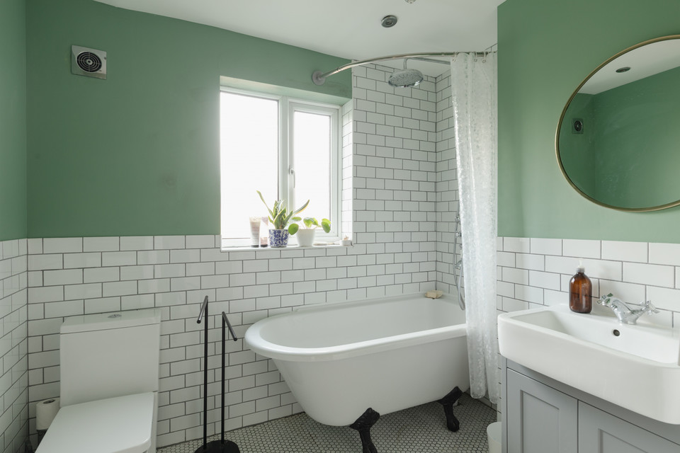 Up to the first floor and a big and windowed bathroom is set to the back of the house, with a roll-top bath, over-bath shower, under-basin cupboard and brick-style tiling.