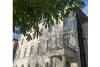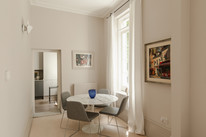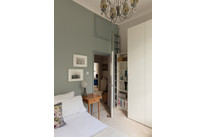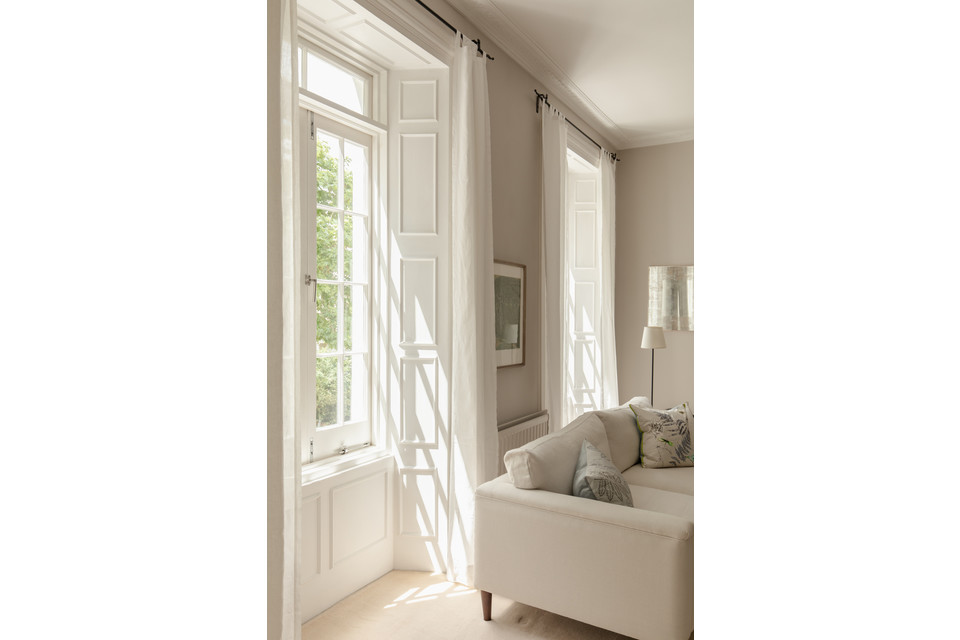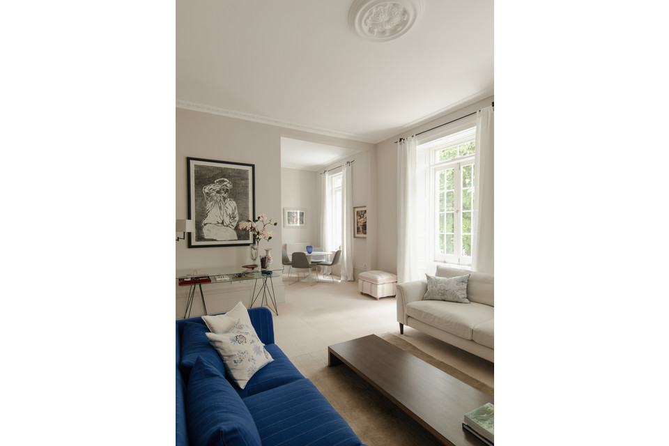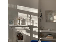 First on your left on entry is the main event - a supersized reception/dining room, with three pairs of French windows (with gorgeous boxwork). Light simply floods in here, and you can enjoy watching the changing seasons courtesy of the mature plane trees (their leaves make a lovely sound as well!). Low fitted shelves, a feature fireplace (with a slate hearth) and pale high-quality soft carpeting complete matters.