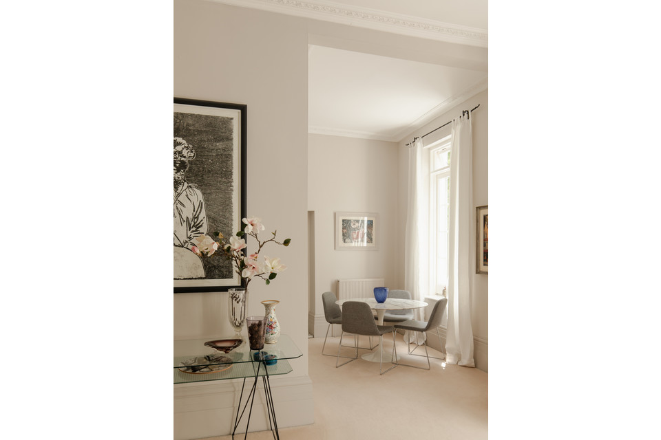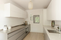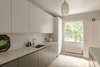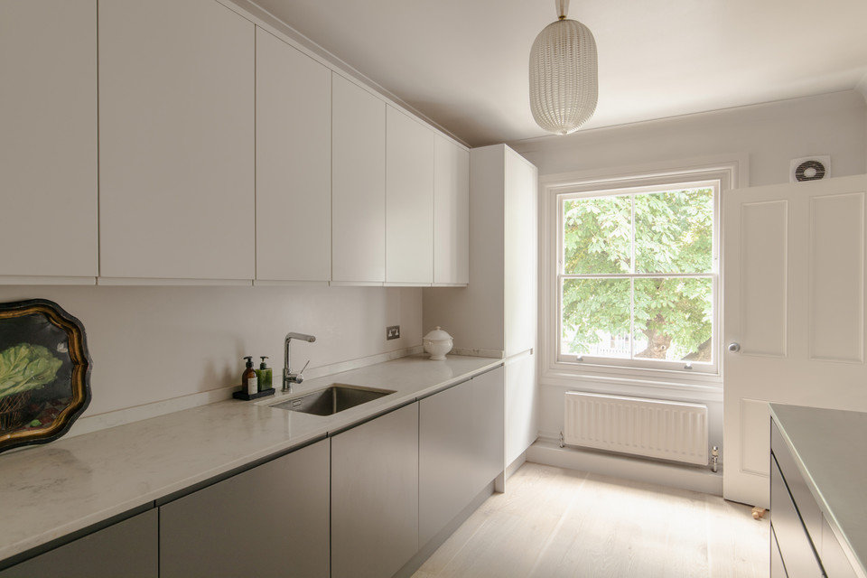 Access your independent kitchen from your dining space. This is a sleek fitted affair with modern matt units in two tones, counters of stone and brushed stainless steel, and high-end integrated appliances (which are included in the sale). A large sash window further impresses.