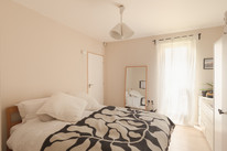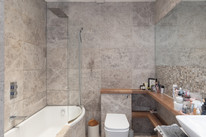 First to your left is a double bedroom of over 13 feet by over 9 feet. This has a door out to the garden (as does your other bedroom; nice!). Next door is the property’s main bathroom with modern fittings, a white suite, and an over-bath shower.