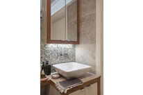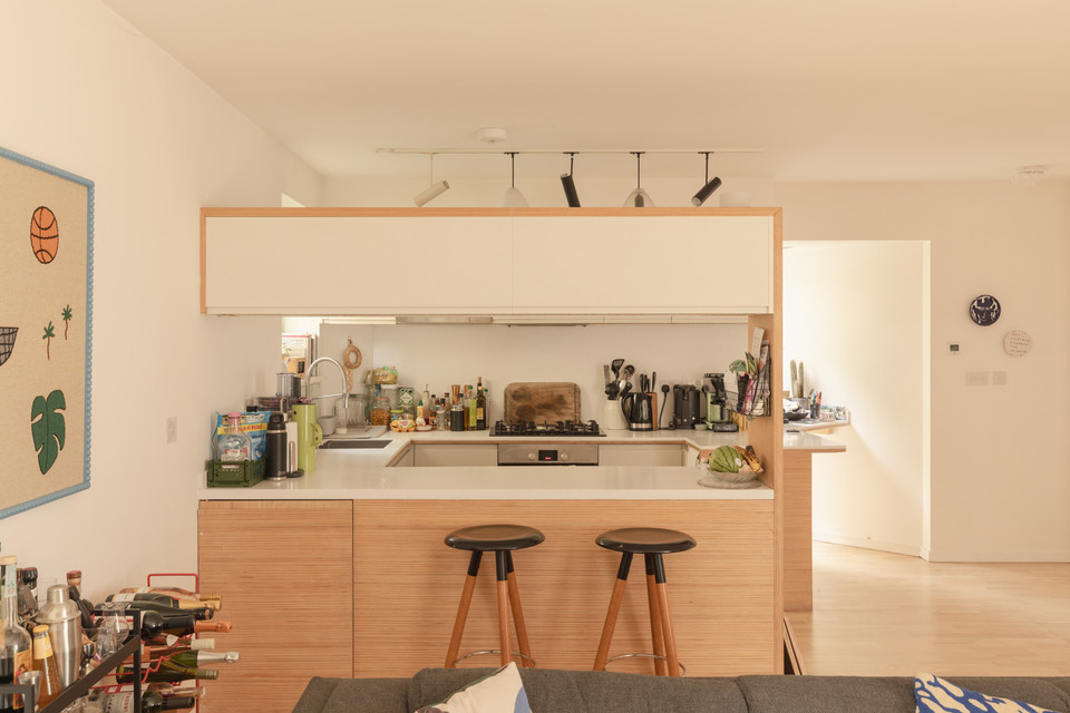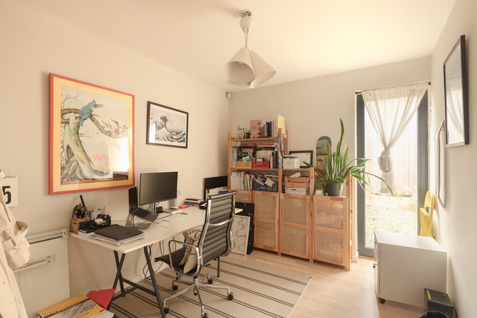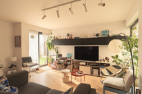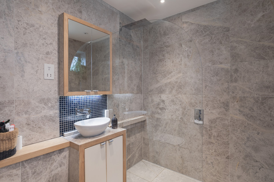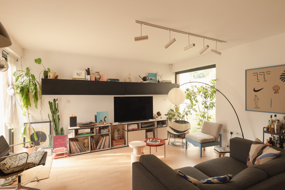 At the end of the hall, the best bit awaits! Your roomy main room which incorporates kitchen, lounge and dining spaces. It is a natural room for entertaining, with studio-style lights (plus pendants over the dining area) and with a sleek modern kitchen (integrated appliances are included in the sale). Underfloor heating flows throughout. Double-glazed double doors deliver you to your notably private lawned garden which gets plenty of sun.