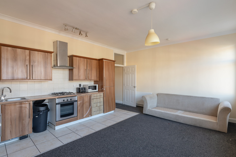 The main room at the front of the flat is large at over 17 feet by nearly 14 feet and incorporates kitchen, seating and dining areas. The area around the kitchen units is tiled for practicality. East-facing windows feature here: fab for morning light.
