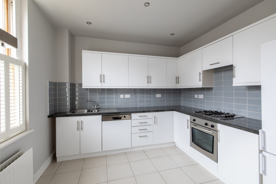 Open your front door and a neat and bright kitchen rests to your left, with a practical tiled floor, modern fitted units paired with classy black granite counters, recessed lighting, custom-made shutters (to lower panes), and space for your table and chairs.
