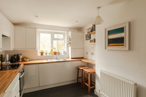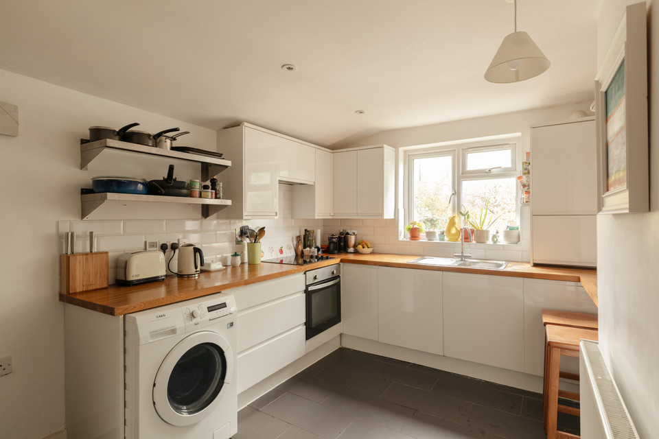 In the shared main door and your front door and own stairwell is up ahead. You first arrive at the generous eat-in kitchen of over 13 feet by over 9. The fitted units are plentiful and gloss white in finish, paired with solid wood counters. It is a particularly bright spot for coffee, breakfast or lunch, thanks to its southeasterly orientation.