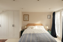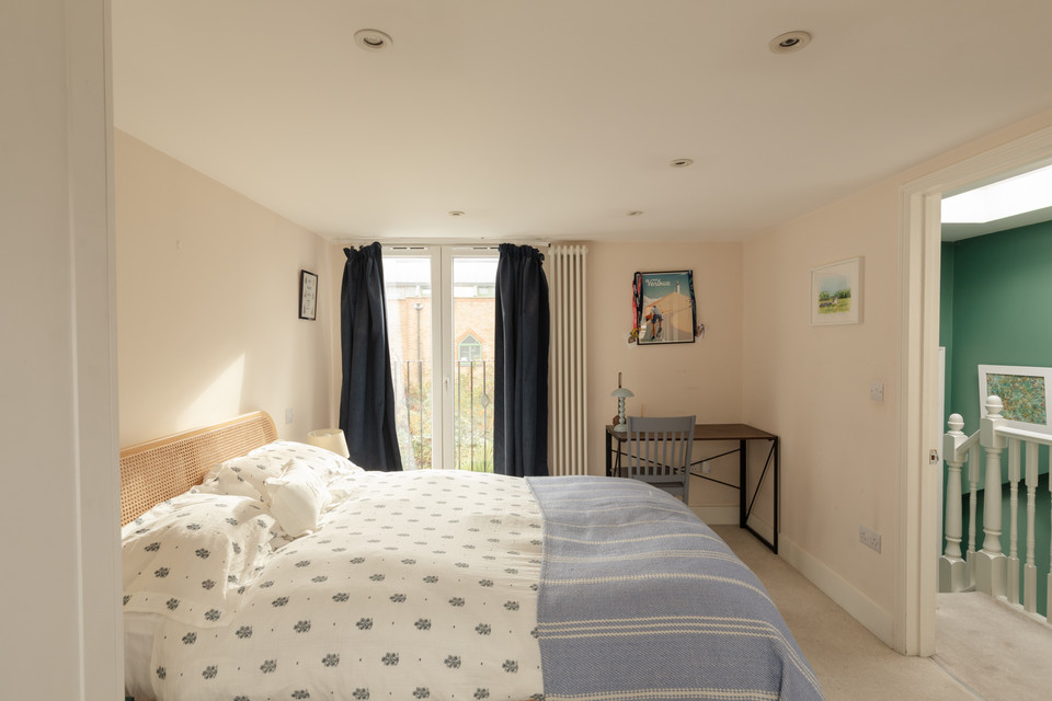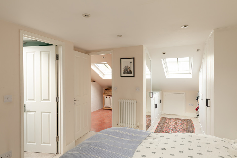 Up to the top of the property and you arrive in the master suite, self-contained in its own floor, complete with Juliet balcony and a beautiful contemporary bathroom finished to a high standard, with smart ceramic tiling plus built-in storage and eaves access, plus a roomy dressing area with built-in cupboards, shelves and another door to eaves access. Both these spaces are lit by skylight.