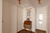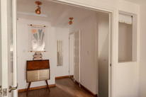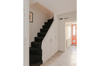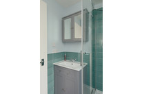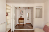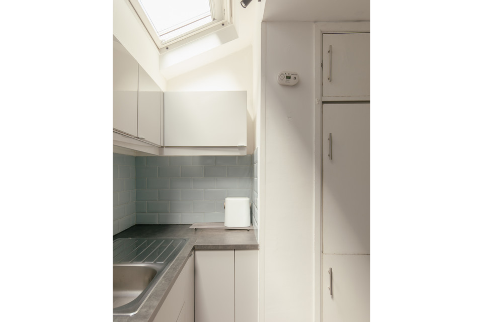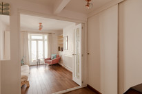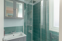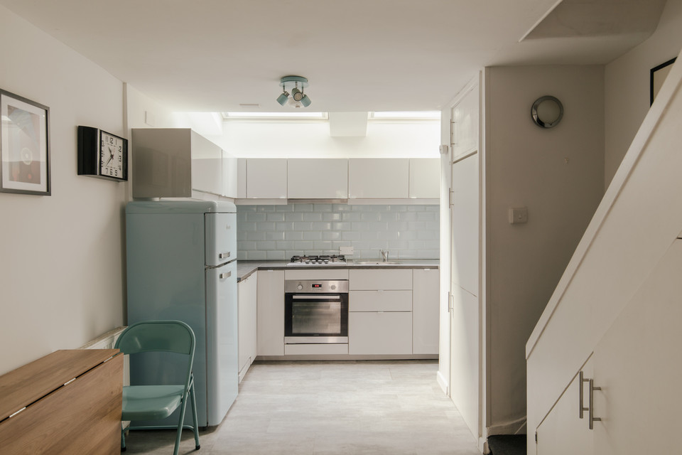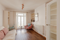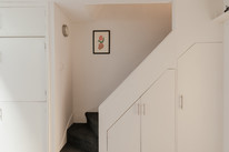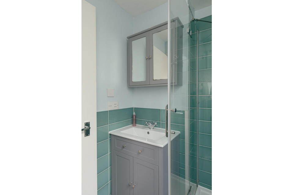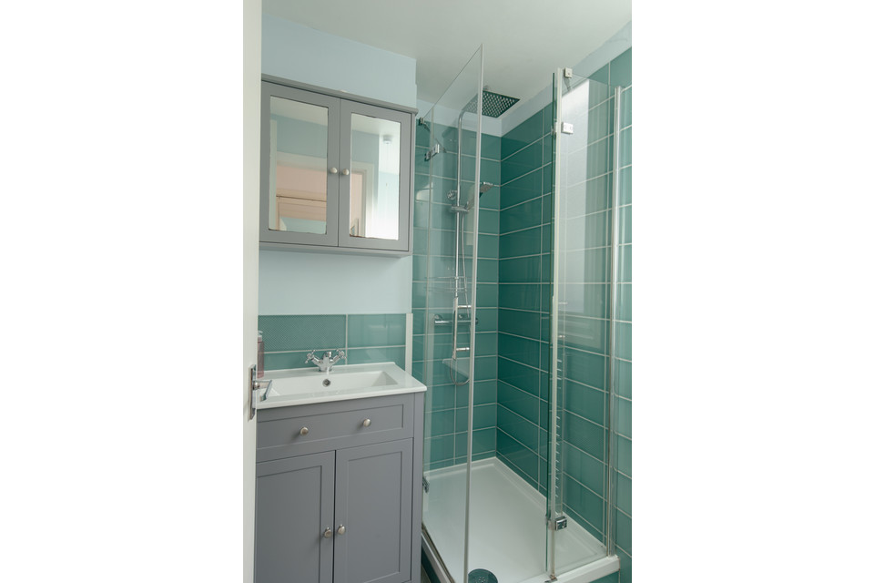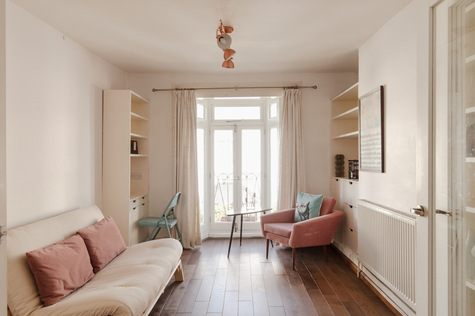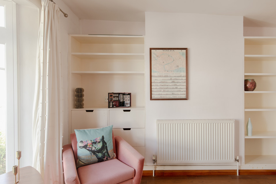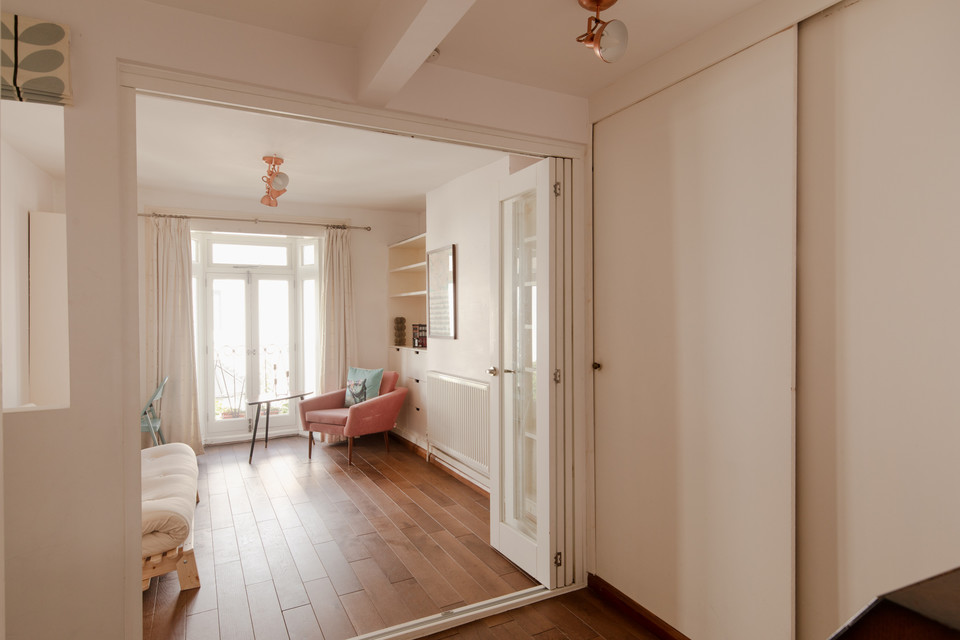 Up to the first floor and you have the property’s shower room to the back of the house. Then you have a lobby/dressing room, and then folding painted timber-framed doors, with blackout blinds, onto the bay-windowed double bedroom. This is 11 feet by over 10 feet, with built-in alcove shelving and drawers. You can open the French doors (inward) for fresh air and full Juliet-vibes.