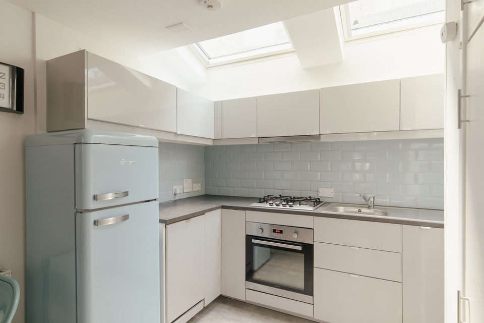 In your front door and first find your reception room. This is open-plan to the modern fitted white kitchen, with a pair of skylights illuminating this area.
