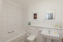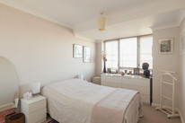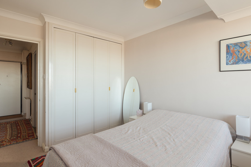 Your own front door is on the third floor and you open into a generous hall. This sets the scene appropriately! First on your left is the property’s main bathroom, with simple white suite. Next door you have a roomy double of over 14 feet by over 9 feet, with built-in closets to the ceiling on the near wall.