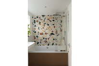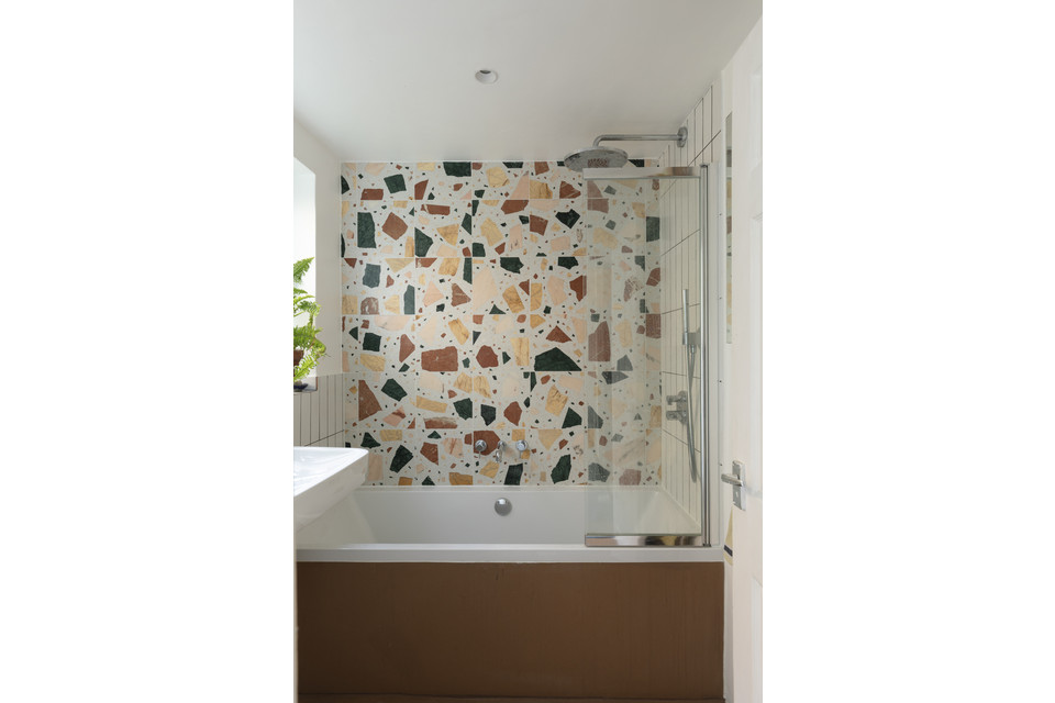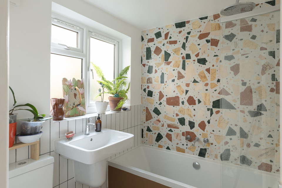 Next on your right from the hall, access your handy cellar (this is over 23 feet by over 7 feet). A great resource for your non-everyday stuff. Then next on your right is a useful built-in cupboard. Opposite this is the back door out to your gorgeous garden (more on this later). Also from this area you access your recently-renovated (double-glazed) windowed bathroom. Smart white sanitary ware here is paired with on-trend terrazzo tiling.