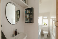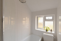 Once in, there is a cute entrance lobby (fab for coats and shoes, and with fitted storage to the wall ahead), then you take stairs up and first on your right is your windowed bathroom. This has a neat white suite and an over-bath shower.