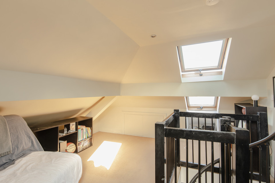 To the front of the property you have your huge, wooden-floored main reception room, of over 12 feet by nearly 17 feet. Fresh white walls and more high ceilings impress. To one corner, take a spiral staircase to the loft room: a brilliant study/hobby room/occasional-guest quarters. Two Velux windows and good (easily-accessed) storage feature up here.