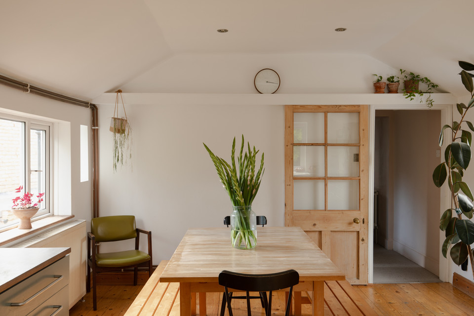 To the rear of the building you have a roomy kitchen/dining room of 18 feet by over 12 feet, with double-glazed windows to all three external walls. Nice! A reclaimed sliding part-glazed pitch pine door is a great feature, and you have stripped boards to the floor. Kitchen units are cool and casual, paired with wooden worktops.