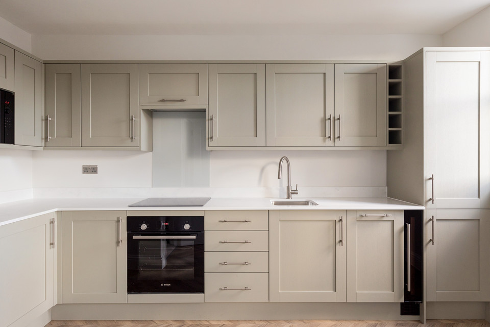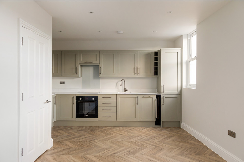 Your herringbone-floored reception/kitchen/dining room sits across the front of the building, spanning over 6 metres. Smart fitted kitchen units are a timeless Shaker style, in a generous L-shape.