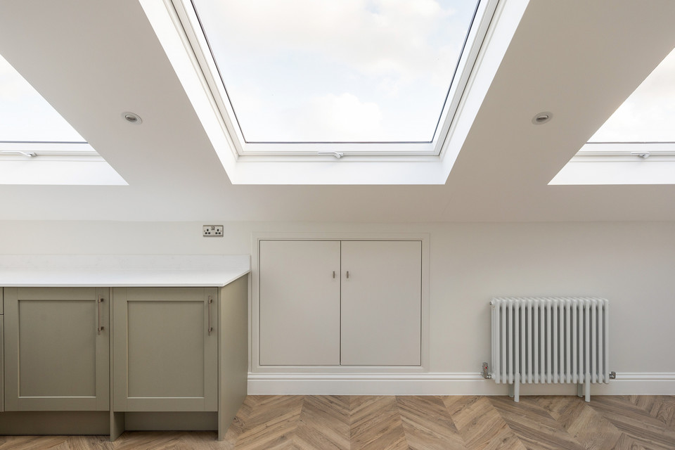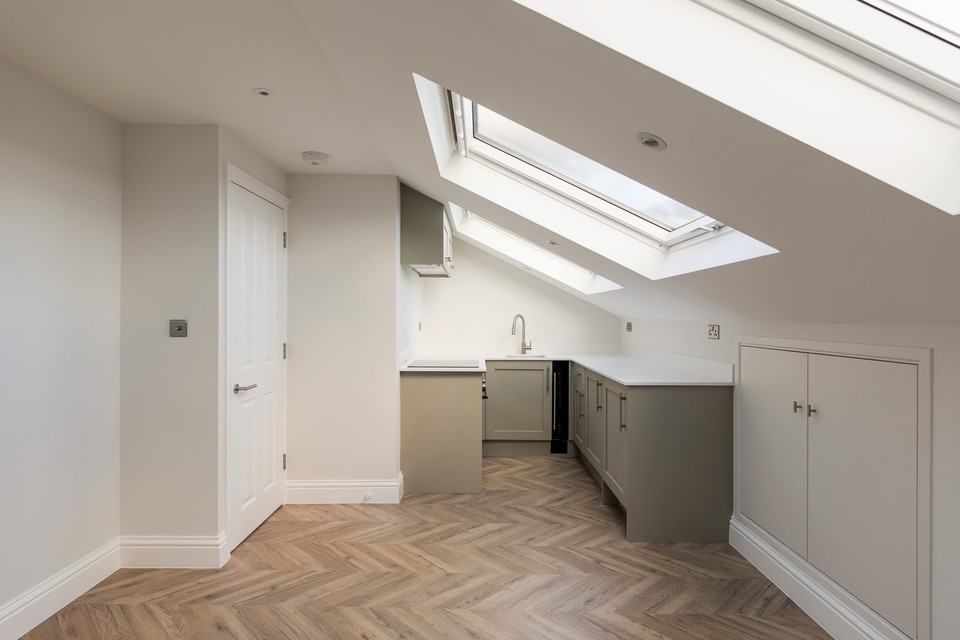 Your double bedroom is a good size, at 3.4 metres by 2.5. Then next door is your main room, incorporating kitchen/seating/dining areas. We love the large skylight windows here, the herringbone flooring, the new Shaker style kitchen units, and the accessible storage to the eaves.