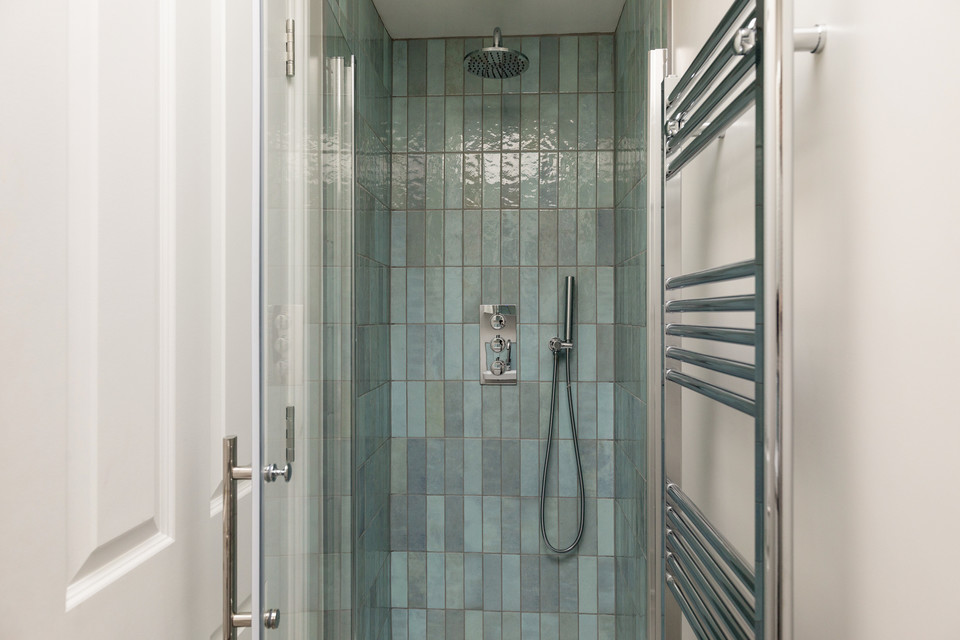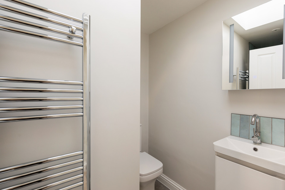 Finally you have your skylit contemporary shower room with concealed plumbing, under-basin storage, glazed ceramic tiling to the shower area, and a separate spray attachment.