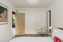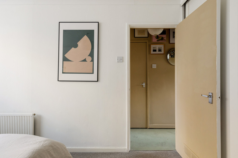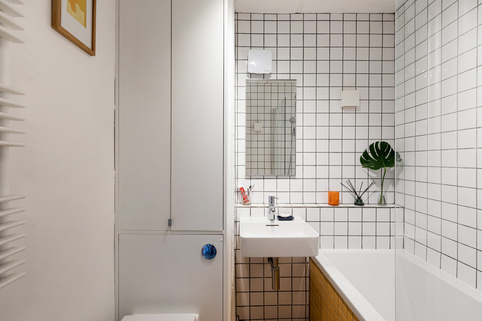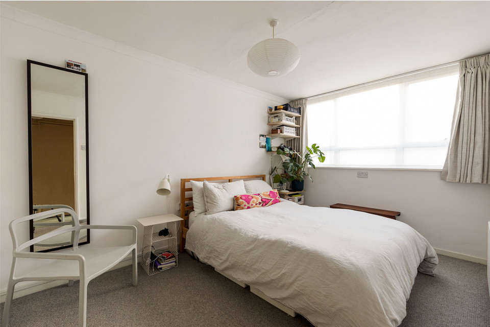 Off your reception room and the bedroom rests next on your left. This is over 15 feet by nearly 9 feet, with a built-in wardrobe to the near wall, with three sliding panel doors. As throughout, the walls are fresh and white.