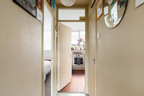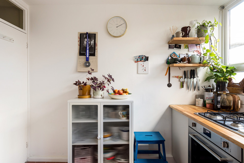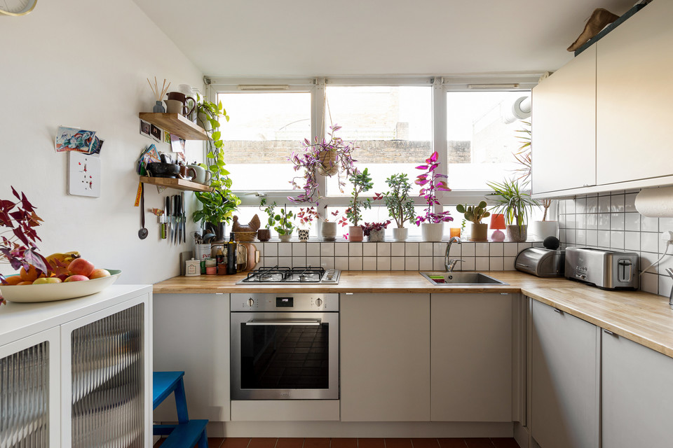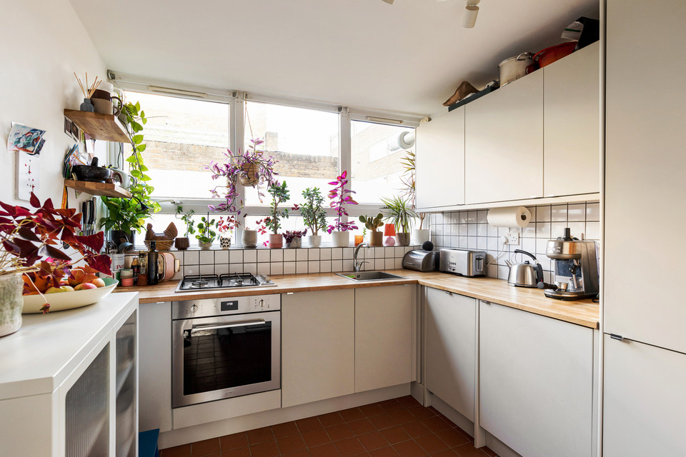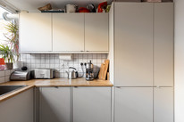 On your right from the reception, you have the neat internal bathroom - stylishly appointed, with contemporary white sanitaryware and built-in storage, then the independent kitchen. This has pale and smart modern wall and base units paired with wooden worktops. Square white tiles look great with contrasting grout (as found in the bathroom as well).