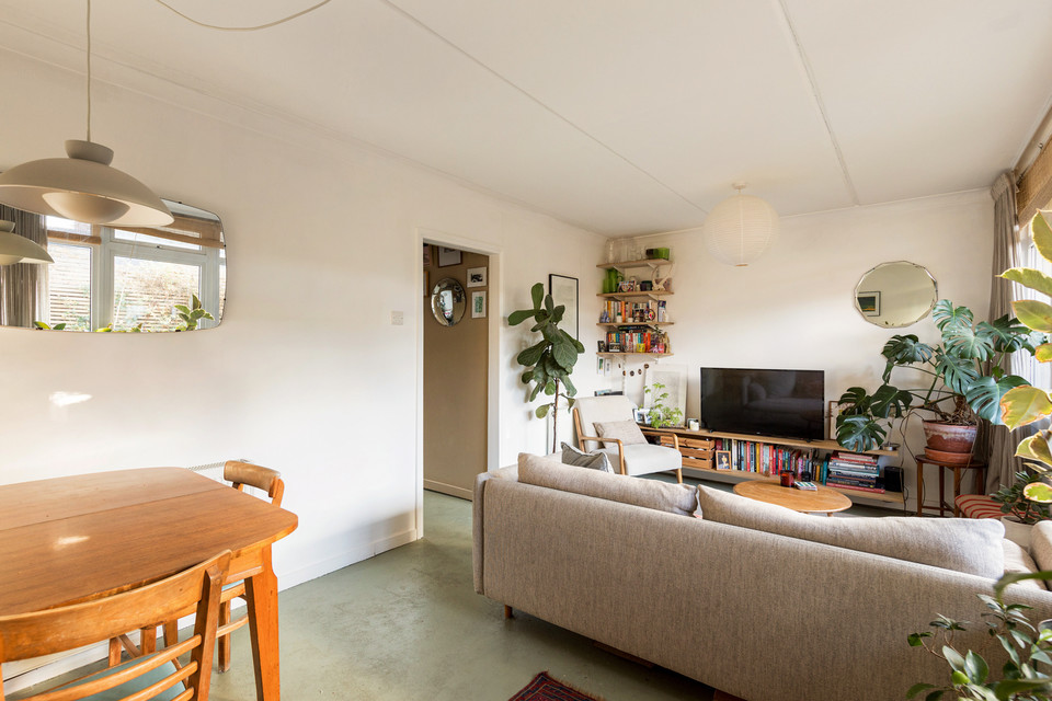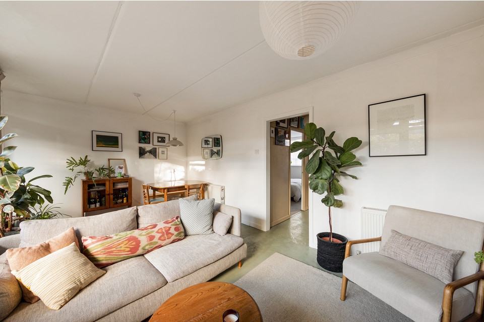 Open your front door into a little lobby, then a second timber-framed glazed internal door to the main reception room. This is large enough for your seating area and for a table and chairs as well, at 18 feet by over 10 feet. A bank of double-glazed windows (the flat is double-glazed throughout) capitalises on your southwesterly orientation.