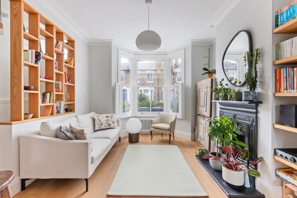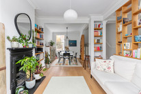 In the front door and you are greeted with a large and light through-space (no stuffy corridors in sight!) where beautiful custom-made shelving has been expertly created and fitted to open up the space and maximise the bright and open-plan feel. The front room area is over 13 feet by over 11 feet, with shutters to your lower window panes, and the second reception (a natural formal dining space) is over 9 feet by nearly 11 feet - with sash window to the side-return.