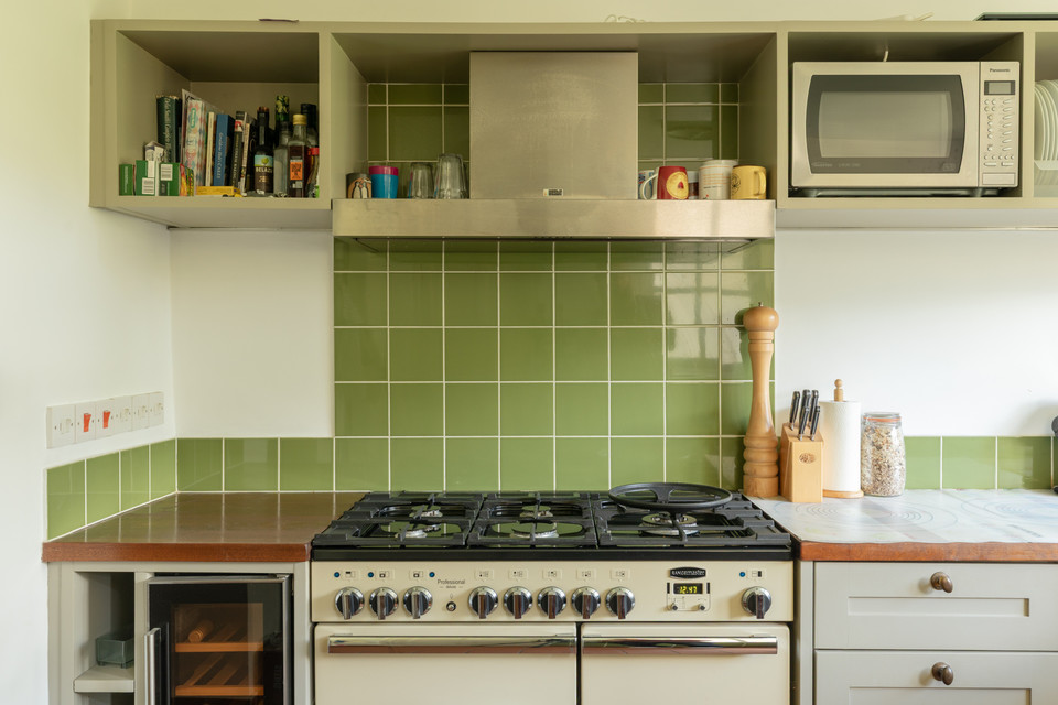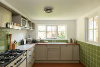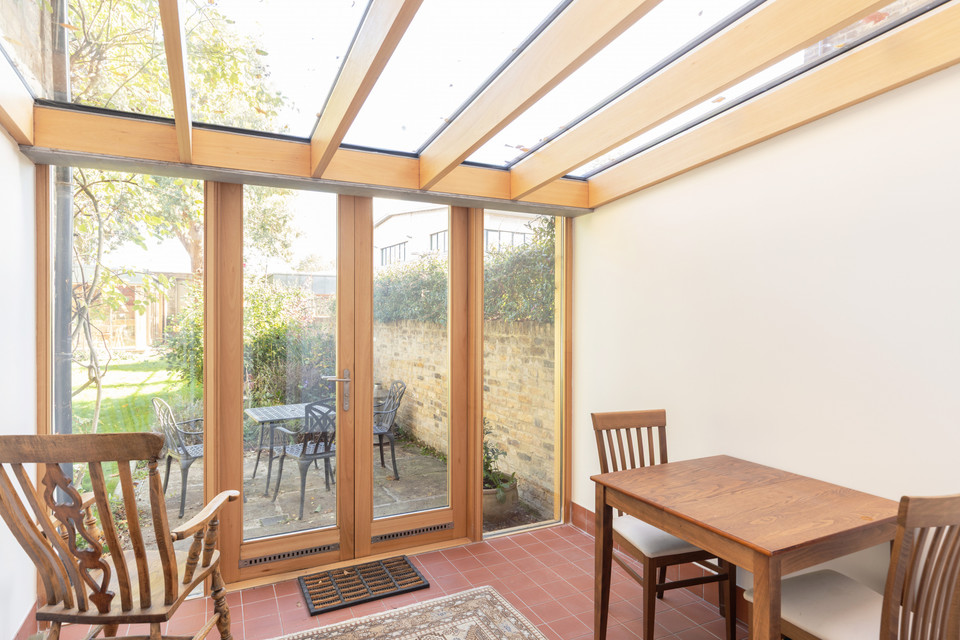 Another reception adjacent ticks yet another box! This one is over 13 feet by over 12 feet, with alcove cupboards and a central stove, plus French doors to the sunroom. The charming kitchen is set to the back of the house with garden vistas over the sink, and a back door out to the sunroom. Smart tiles run from the kitchen through to here. The fitted kitchen has timeless Shaker style units and wooden counters.