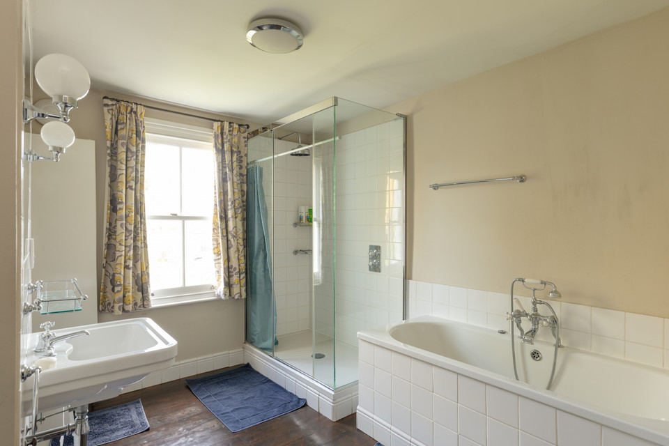 Your first floor hosts three smashing sash-windowed bedrooms: two doubles over the through-reception, and a single (of over 8 feet by nearly 6 feet) over the hall. At the rear of the floor is a large bathroom with an independent shower and a separate bathtub. Fittings are fittingly traditional in style, as is the sanitaryware.