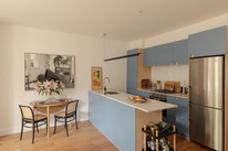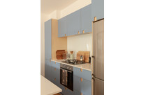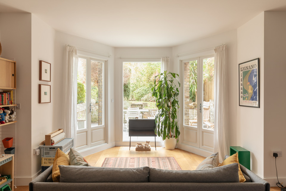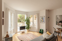 You open directly into your main roomy reception room which is open-plan to the neat modern kitchen. In cool ply (units and fronts), this has a generous number of wall and base units. The large bay onto the garden is a wonderful heart-winning feature, and French doors plus a central feature window impress. Underfloor heating throughout keeps the whole apartment cosy (and walls free for flexible furniture placement).