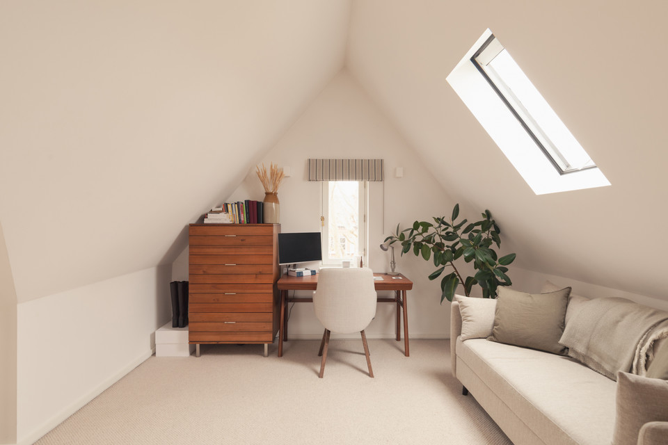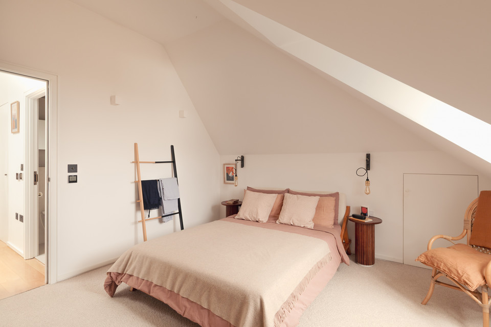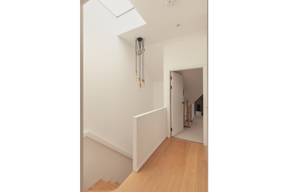 On the second floor, find two further double bedrooms. The bedroom to the front is over 14 feet by over 12, with one regular and one skylight window (you also have a skylight window over the stairwell). It has a built-in wardrobe and handy eaves storage as well.