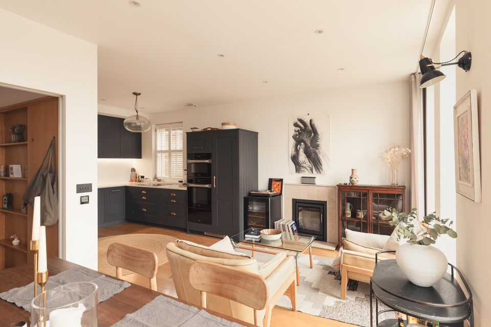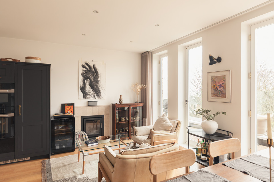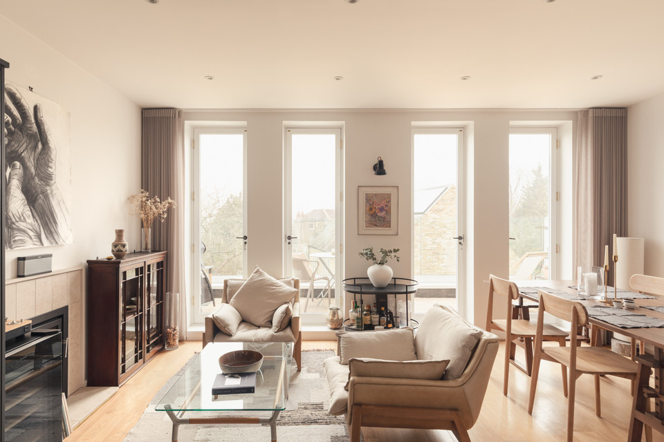Take a right and you land in the huge, double-aspect reception area, which stretches over 22 feet. It has a wonderful real fire for cosy nights in, and four tall and timber-framed glass doors which open to that low-maintenance balcony we have already mentioned. This is an utter treat whatever the season, thanks to its full southerly orientation.