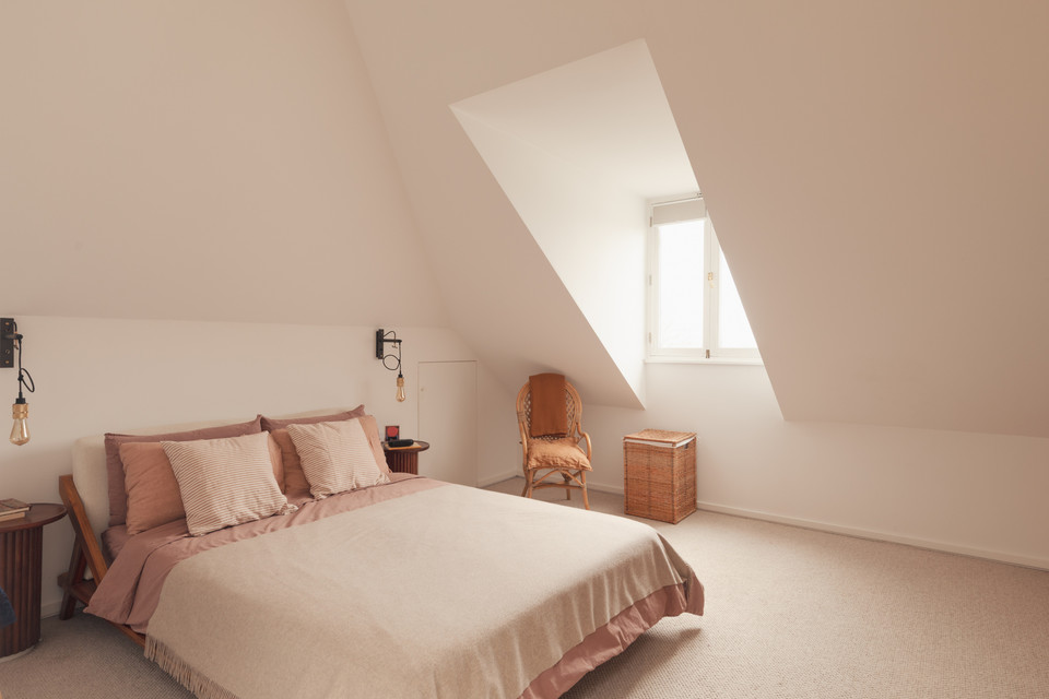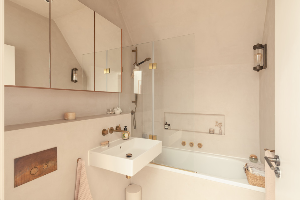 In between the two bedrooms is the main bathroom: a fully microcemented House bathroom, with unlacquered brass fittings.