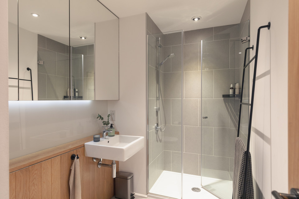 Moving through the flat, you’ll next find a modern shower room with large walk-in shower, smart mirrored cabinets, and large profile tiling.