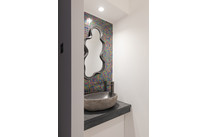 Drop down to your kitchen/reception from an oversized opening here, or from the hall (noting the understairs cupboard and cute guest w.c. to your left before you get here). Running 21 feet to your glazed folding doors, with large profile floor tiling, it is an excellent entertaining or family space, with a multitude of wall and base units plus integrated appliances. Marble counters and central island add to the welcome luxury vibes.