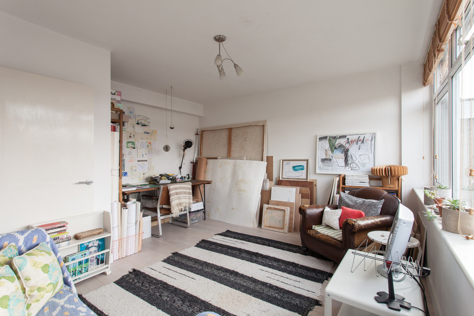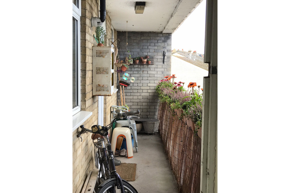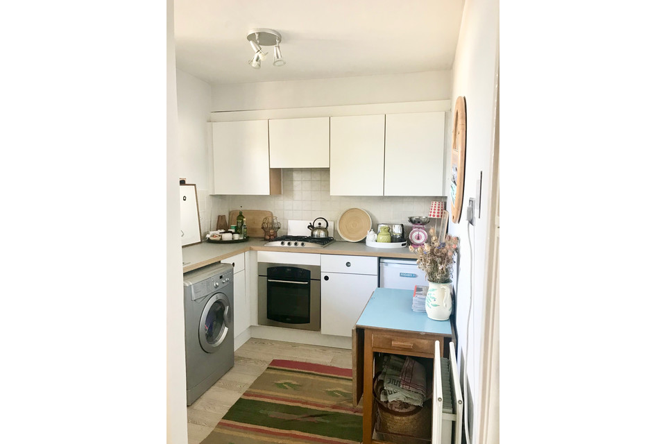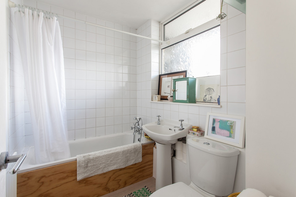 The flat measures in at over 500 square feet and it’s been really well designed with plenty of storage, and a huge reception room. At the top of the stairs there’s a door to the balcony area where you’ll find your front door. Open into the hall and the bathroom sits off to your right. It has a neat white suite, white tiles and white walls, plus a frosted and double-glazed window (the flat is double-glazed throughout).