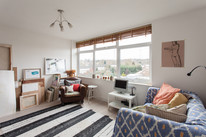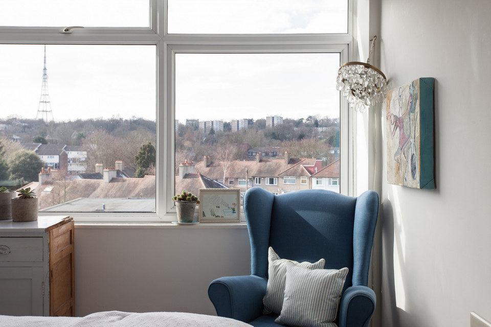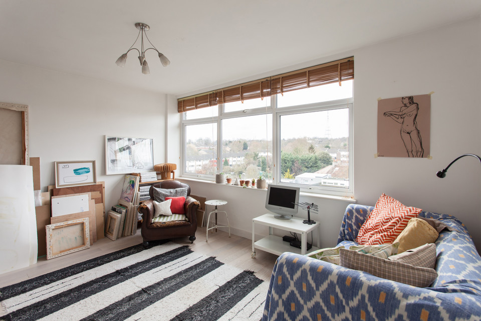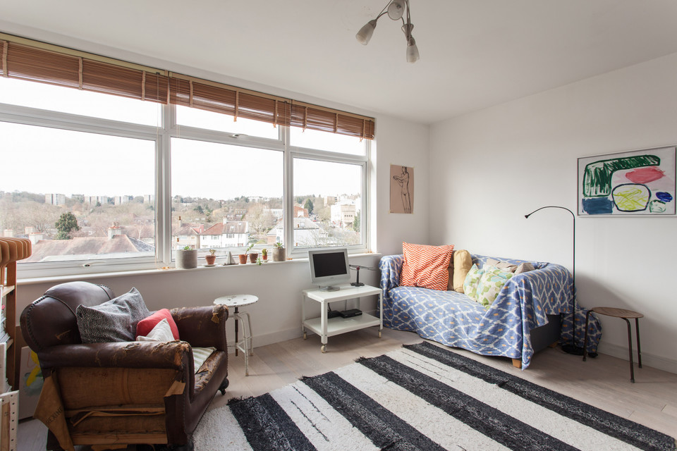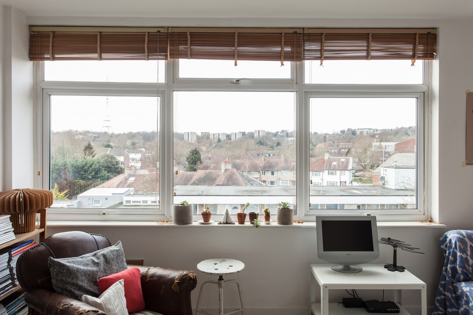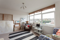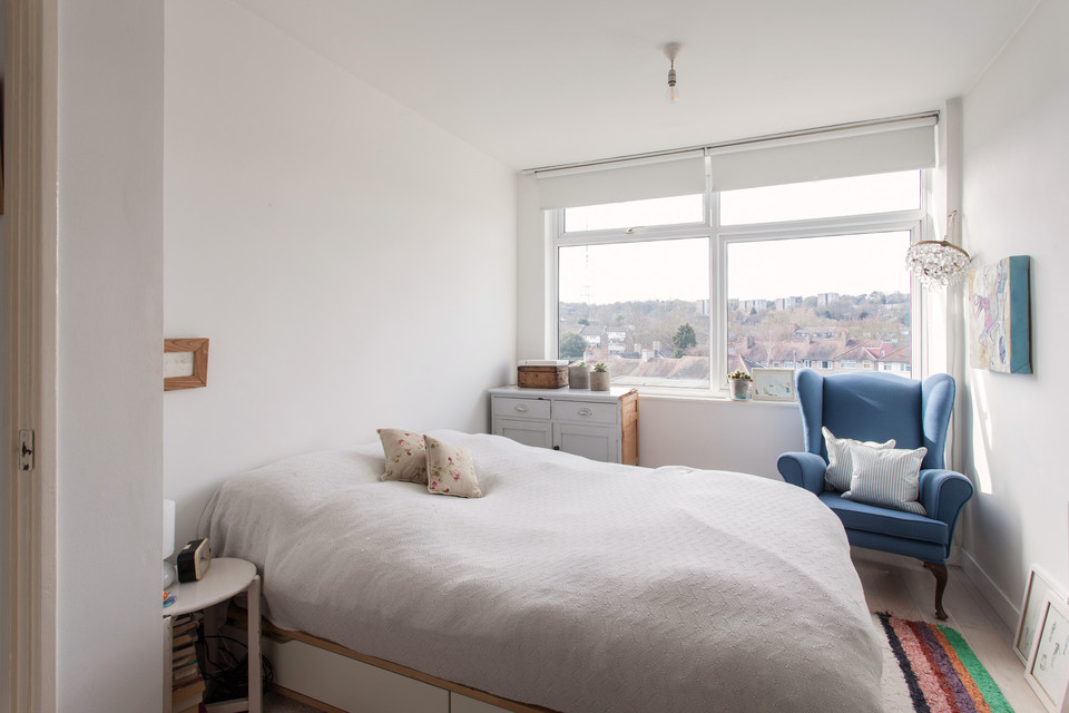 Off to your left of the hall for the eat-in kitchen with a large window, more white square tiles, and fitted wall and base units. Large built-in floor to ceiling cupboards serve this room, and there’s another for cleaning bits or whatever, in the hall. The reception room offers wonderful west-facing views and is roughly 13 feet by 14 feet. The bedroom completes the tour. It’s a double with a built-in wardrobe and more top views.
