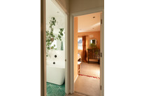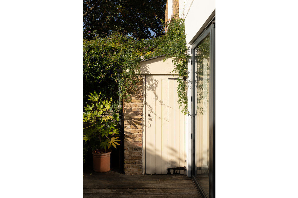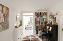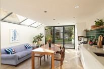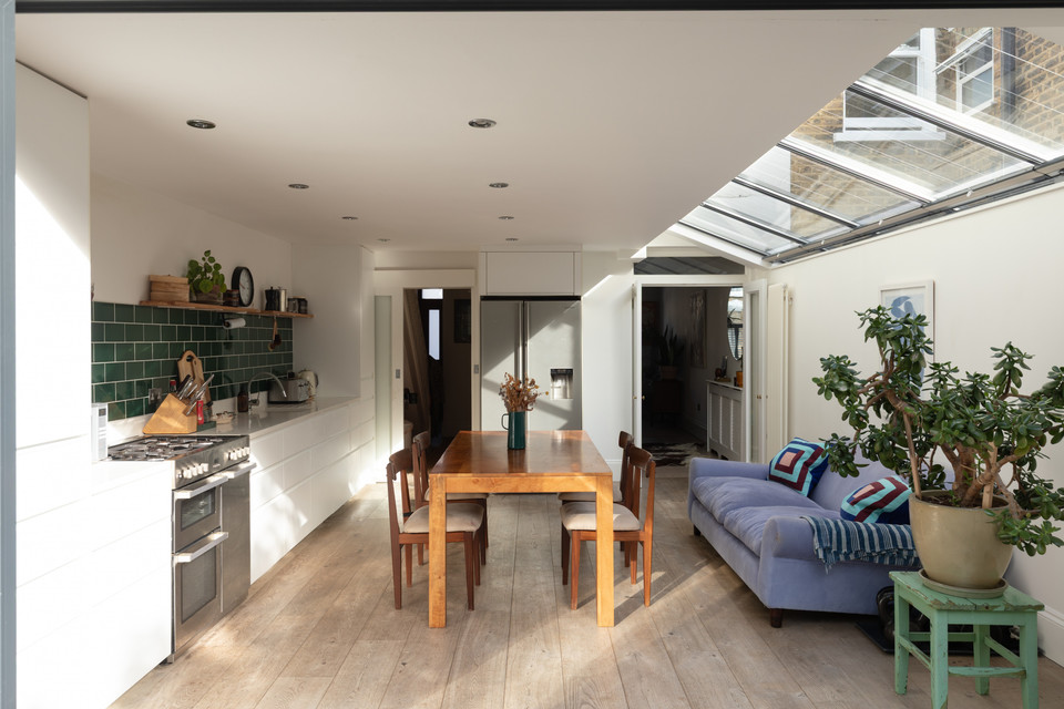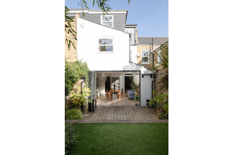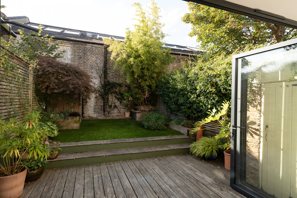 Folding doors open all the way, at the foot of the room, and large skylight windows over the former side-return add to the already fabulous light (the room faces south-east). A long bank of slick, white and handle-free kitchen units grace one wall, paired with glazed green metro-tiles. The garden has both decked (following the flow of the internal floor boards) and faux-lawned areas, with established borders.