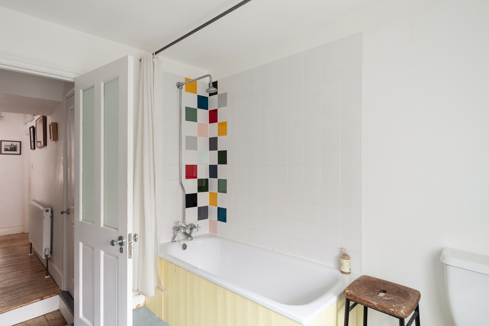 On your first floor you have a large bathroom to the back of the building. This has a smart white suite and traditional-style fittings (including over-bath shower). Off the main landing you have a bright eat-in kitchen (of over 11 feet by over 10 feet) then a large reception/sitting room across the front. This is over 16 feet by over 11 feet, with white walls (as throughout), wooden floors, a trio of sash windows with an easterly orientation, and a central wood-burner.