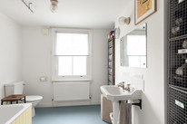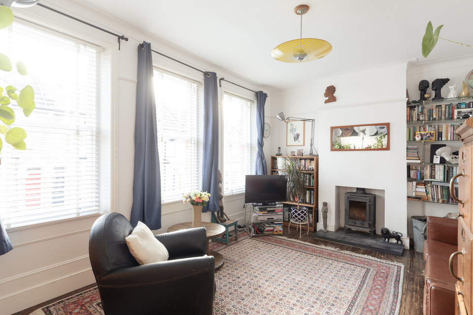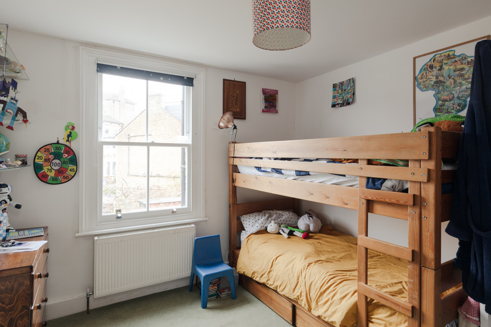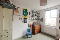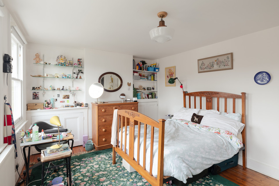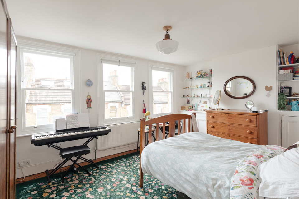 Up to the second floor and your large principal bedroom rests above your reception room. Stripped wooden floors, another trio of east-facing sash windows, and built-in alcove cupboards all pleasingly feature. Next door is a carpeted double bedroom of over 11 feet by over 10 feet.