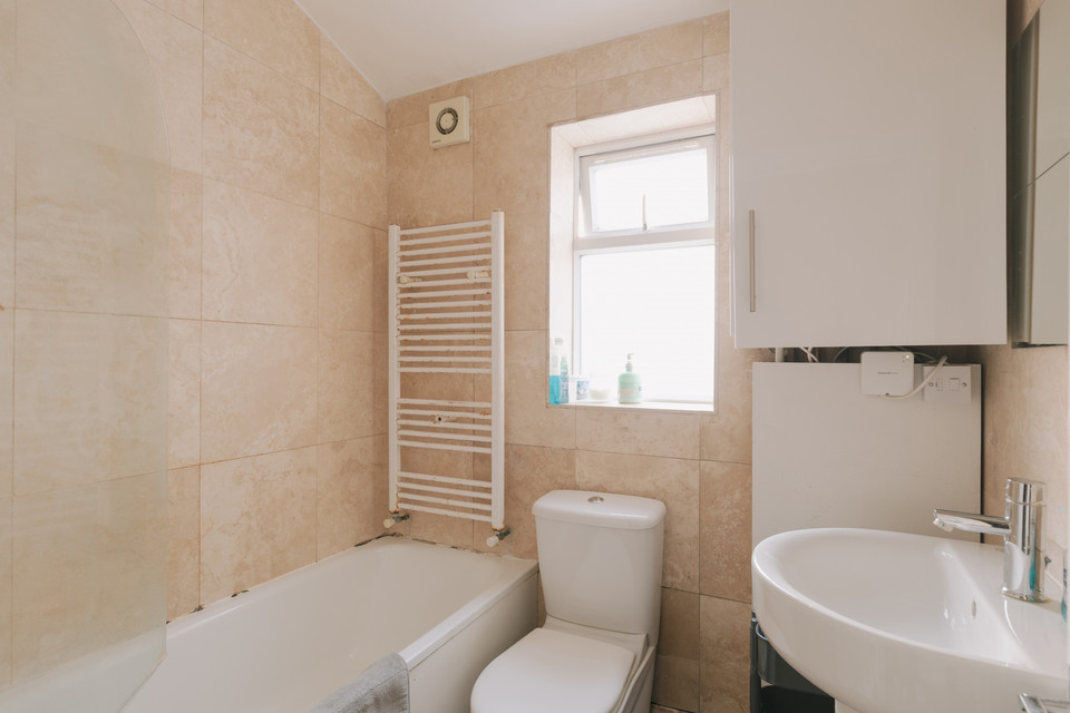 At the back of the property you have your principal bedroom, of over 13 feet by over 8 feet, with windows to both external walls. Next door is the windowed bathroom, with travertine tiling and white sanitaryware.