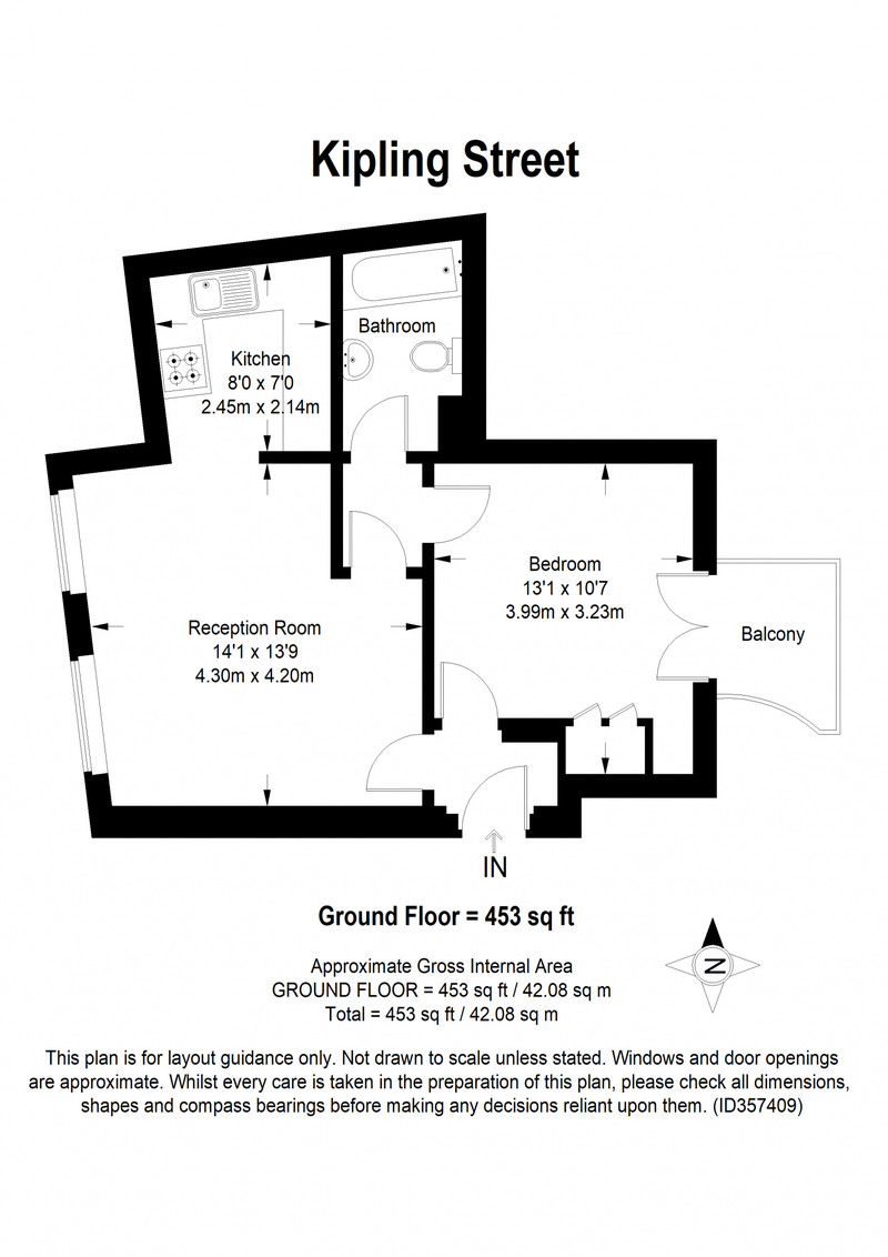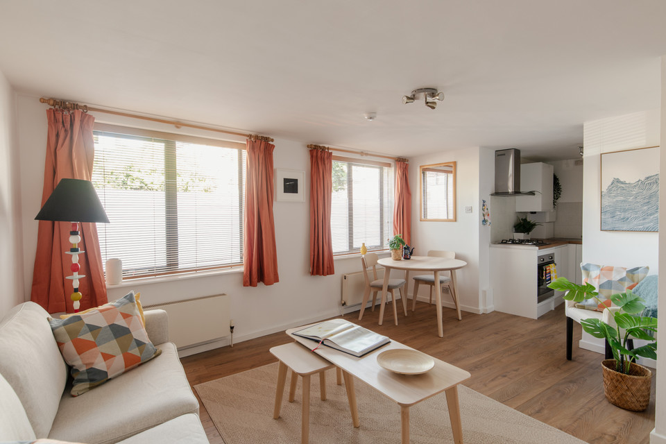 Once in, open the door to your left and you land in the large reception room of 14 feet by 13 feet. As throughout, walls are fresh and white. There is plenty of space here to zone seating and dining areas. Two double-glazed windows face west (great afternoon light).
