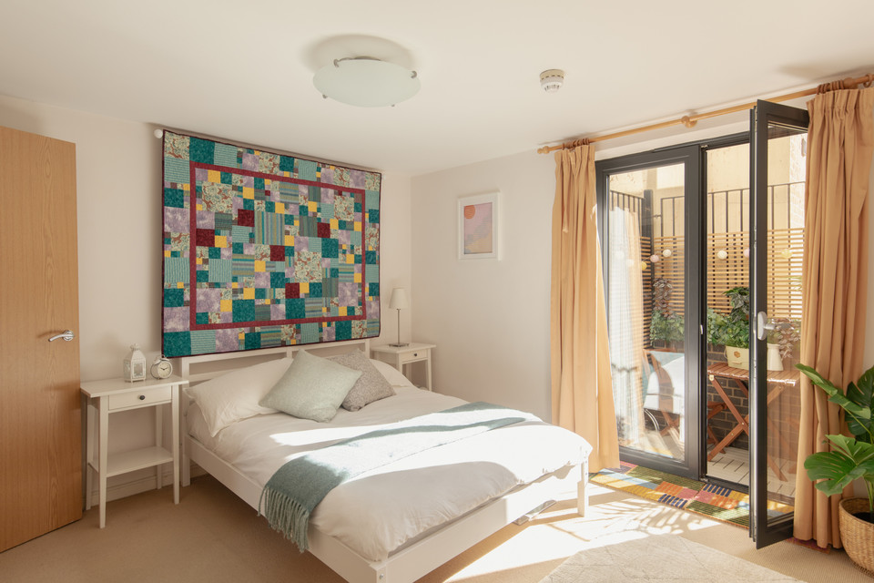 From the entrance hall, open the door straight ahead for your generous carpeted bedroom, of 13 feet by 10 feet. A built-in closet pleases here, plus access to your courtyard garden. A real sweet spot for a morning cuppa or an evening tipple or two.