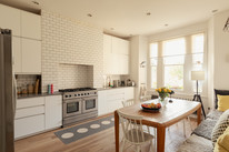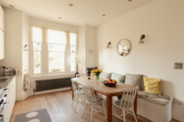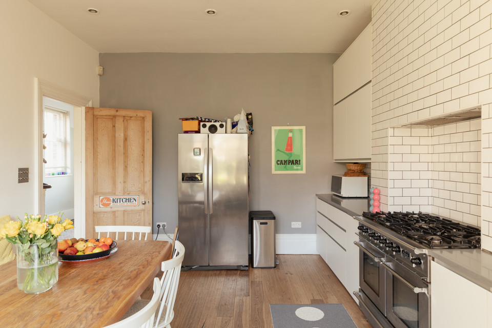 Next door is your sunny large-sash-windowed kitchen/dining room, of over 17 feet by over 12 feet. Raised views over your gorgeous garden are just delightful, and as next door, you have a column radiator. Your fitted kitchen units are simple and timeless in style, teamed with metro-style tiling and a large range cooker.