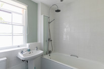 The windowed bathroom is a pleasingly-simple affair, with white suite and an oversized over-bath shower. A generous storage cupboard completes the floor.