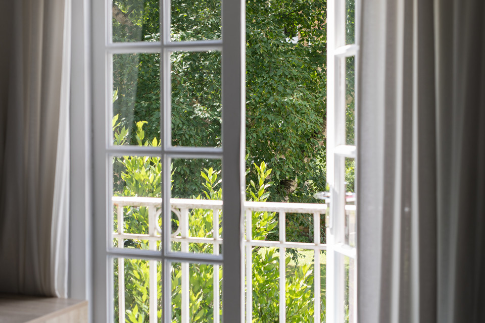 Adjacent is the first of your four bedrooms (also overlooking the lawn), of over 10 feet by over 8 (or use it as an additional reception room should you prefer). This room also has a parquet floor. French doors open onto the balcony here.