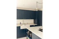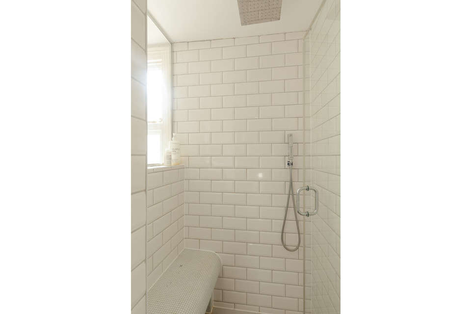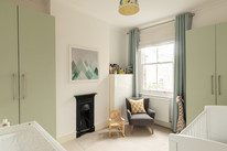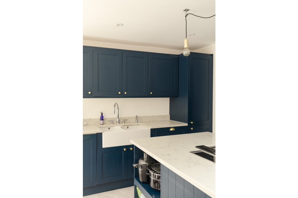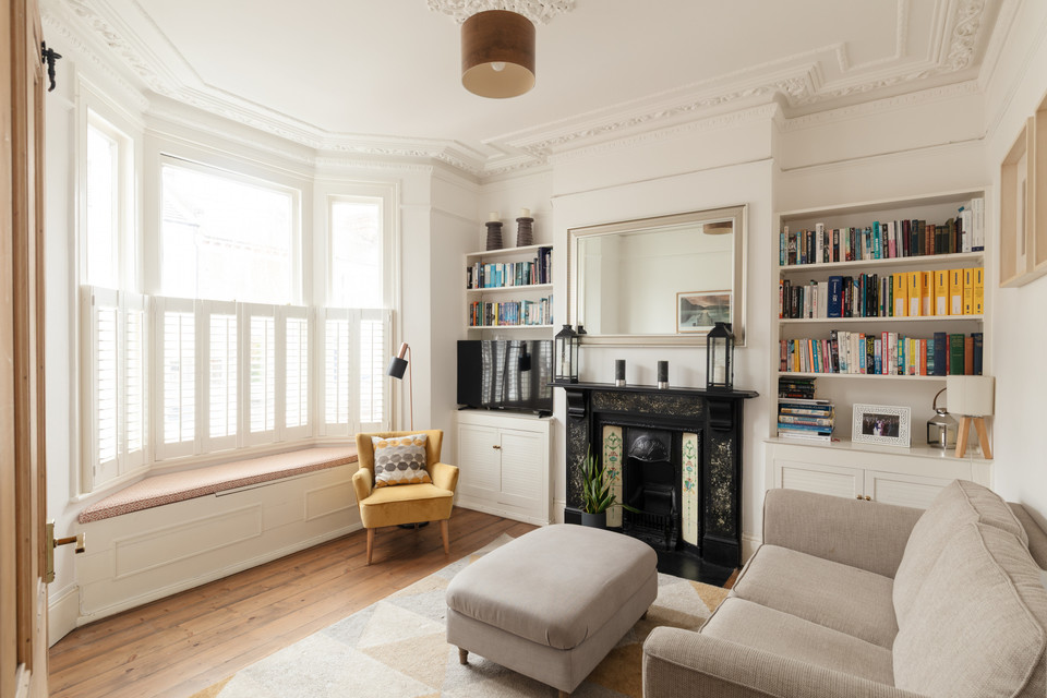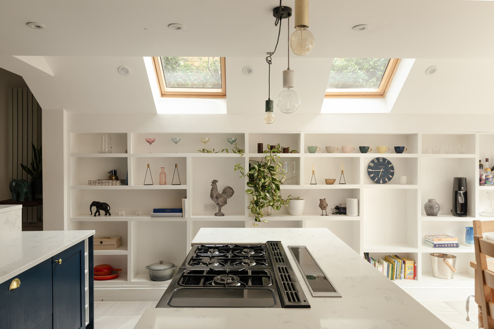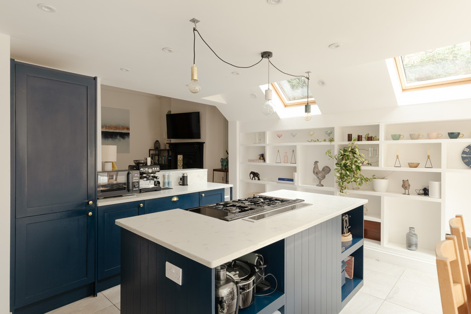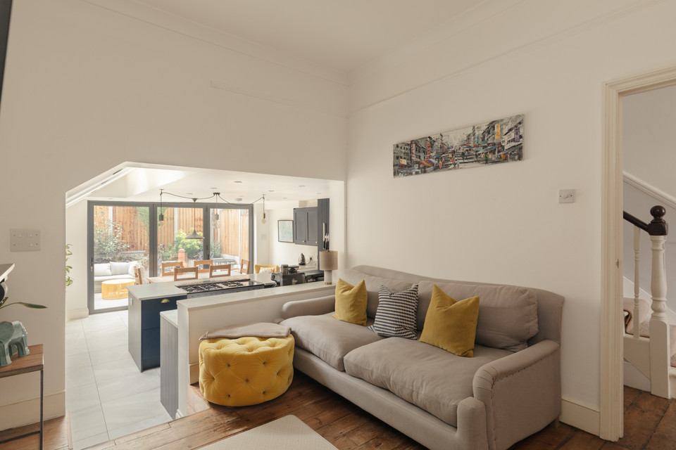 Adjacent is a second generous reception room: a natural den/TV room, of over 10 feet by over 11 feet, which is part-open-plan to your fabulous kitchen/reception. Such a great setup for entertaining, your back room is over 16 feet by nearly 15 feet, with modern tri-fold double-glazed doors onto your sunny and low-maintenance garden, plus a pair of Velux windows. The kitchen has timeless navy Shaker-style units, high-end integrated appliances, and a central island, plus lots of built-in shelving.