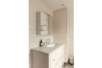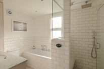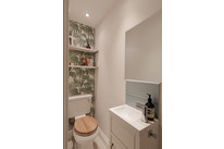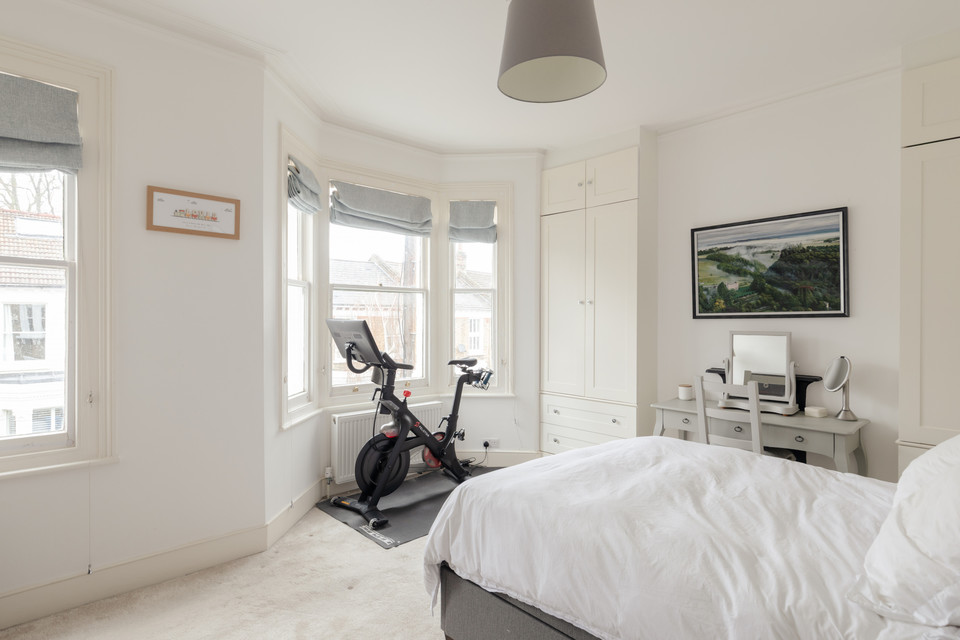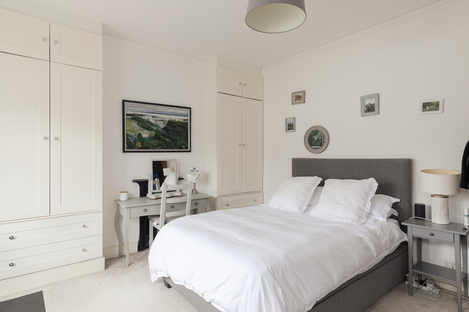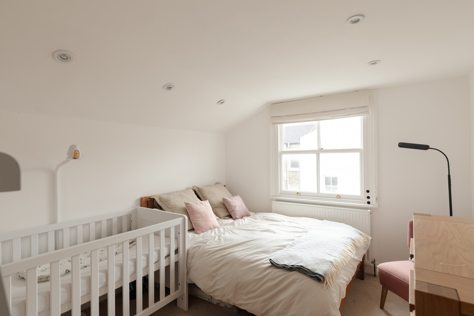 Up the stairs and from your half-landing you have the property’s main (windowed) bathroom straight ahead. This is well-designed, with both bath and independent shower, brick-style tiling, and good built-in storage cupboards. Next door is a cute study/nursery, of over 6 feet each way.